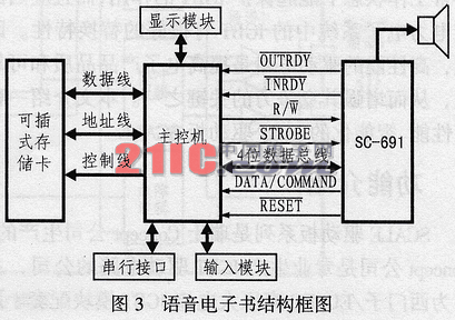 图3是一个语音电子书的系统结构图。其中可插式存储卡内存储的是SC-691可用的语音数据。通过更换可插式存储卡的内容可以更换电子书的内容。一般情况下,可使用MMC卡。